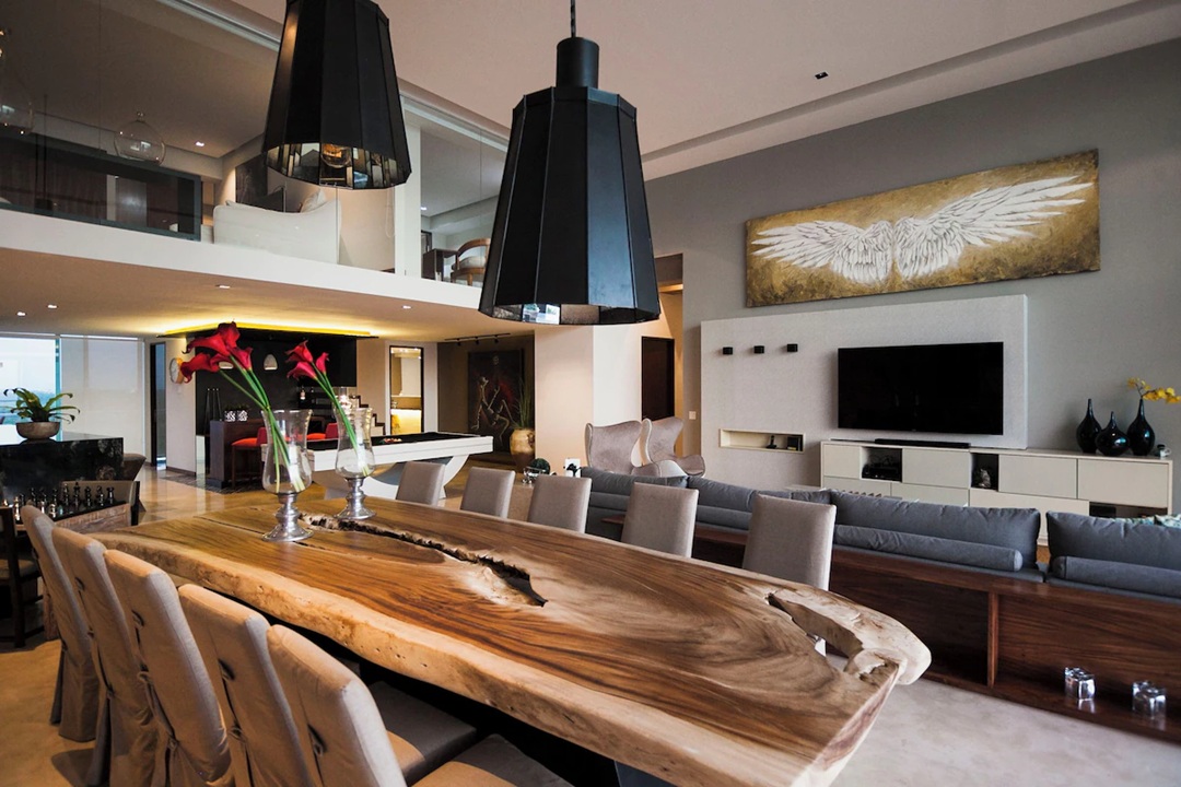 Our fully equipped villas feature spacious roomsโperfect for couples, solo travelers, or shared staysโalong with open floor plans, modern amenities, and private pools. The elegant dining and living areas overlook the bay, while the lower-floor bedrooms and terraces offer views of the pool, courtyard, and lush tropical gardens.