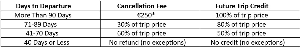 For eligible bike tours plus triathlon, swimming, and trail running, choose between paying a cancellation fee or receiving a future trip credit/partial trip credit based on the chart below (fees are per guest):