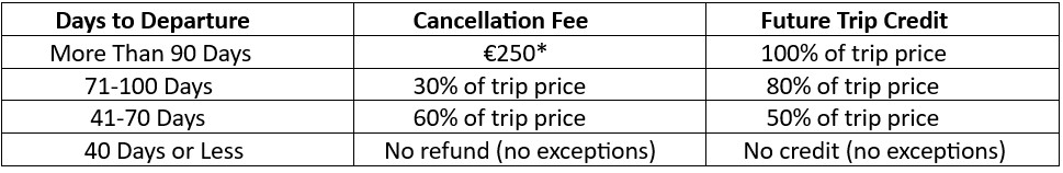 For eligible Bike tours plus Triathlon, swimming, and Trail Running, choose between paying a cancellation fee or receiving a future trip credit/partial trip credit based on the chart below (fees are per guest):