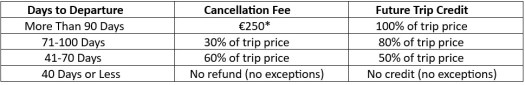 For eligible bike tours plus triathlon, swimming, and trail running, choose between paying a cancellation fee or receiving a future trip credit/partial trip credit based on the chart below (fees are per guest):