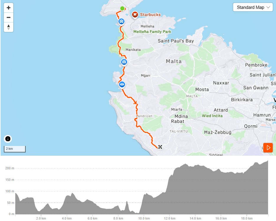 Today we explore Maltaโs spectacular coastline with a scenic trail run across the island. The run starts near the Cirkewwa Ferry Terminal and follows coastal trails and countryside paths south across the island, finishing at the dramatic cliffs of Dingli.